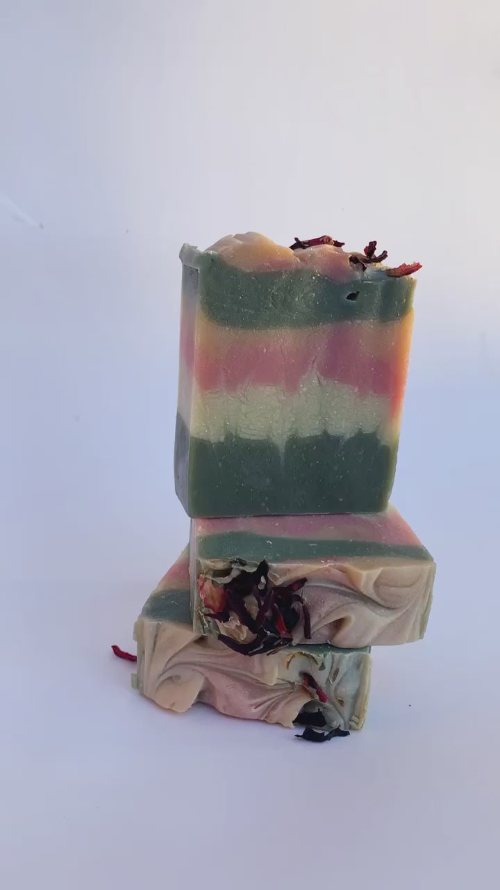 Our beautifully crafted artesian soap bars feature a green, pink and gold colour pallet and are topped with dried hibiscus that will make a statement in any bathroom.